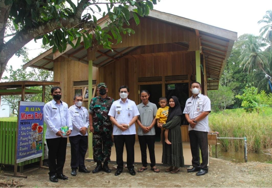 Acara dirangkai dengan peninjauan langsung ke lokasi bantuan rumah layak huni sekaligus pemasangan stiker oleh Bupati HST.