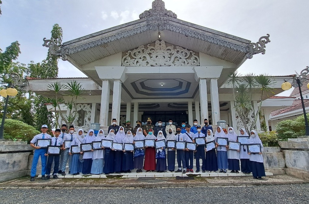 Bupati HST H Aulia Oktafiandi beserta jajaran unsur Forkopimda berfoto bersama para siswa-siswi berprestasi dari Kabupaten HST.