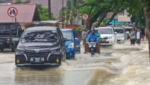 Selain rumah warga, banjir juga merendam Jalan Nasional A Yani, hingga mengganggu pengendara yang melintas dan membuat jalan macet.