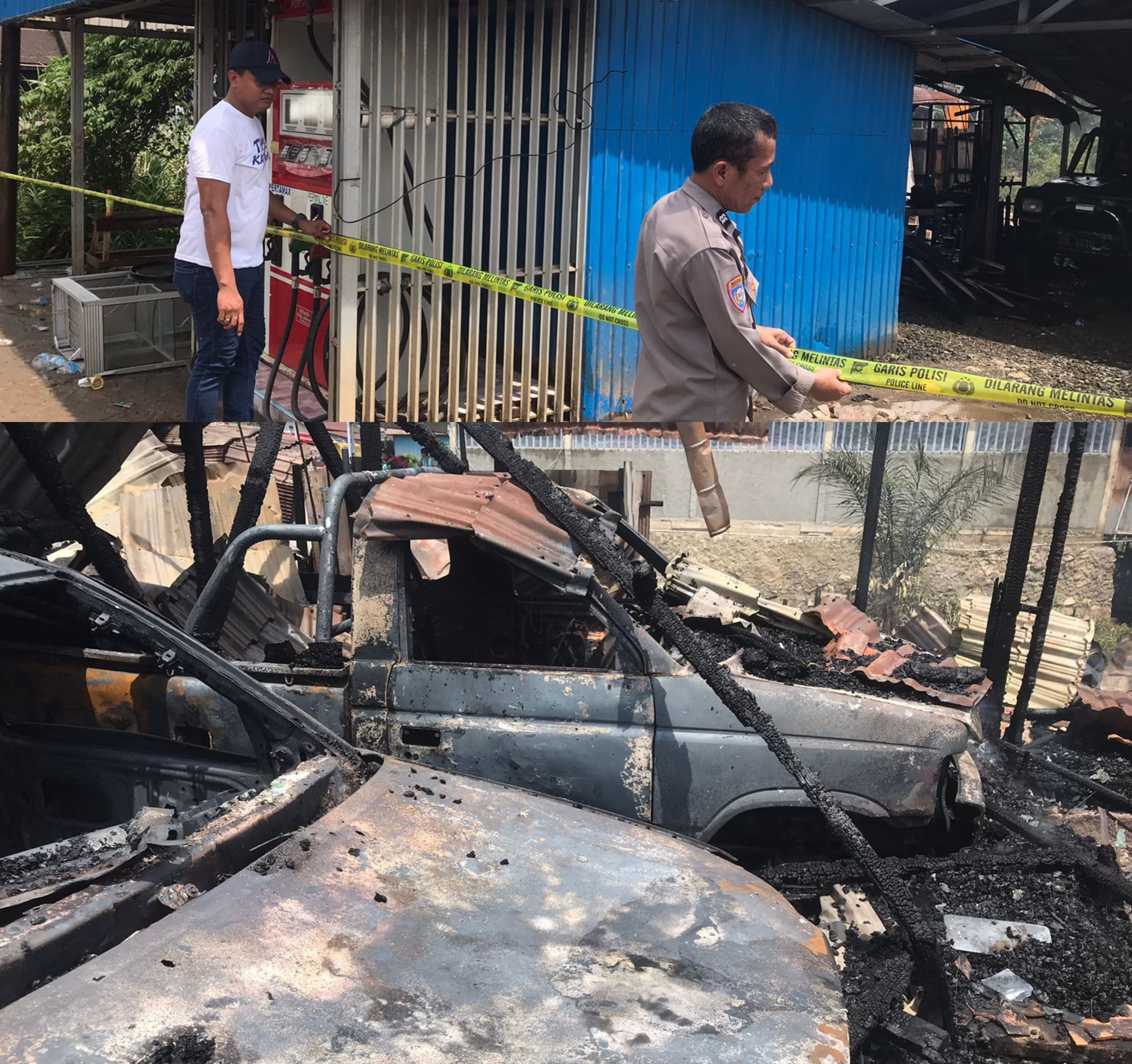 “lalu tiba – tiba saja datang api dari arah rumahnya seketika menyambar tangki Bahan Bakar Minyak (BBM) mobil feroza tersebut, serta api menjalar ke mobil dan sepeda motor yang parkir berdekatan dengan mobil feroza tersebut. Hingga membakar habis rumah Bustani dan Sumarjo yang berdekatan rumah,” ucap Kasi Humas.