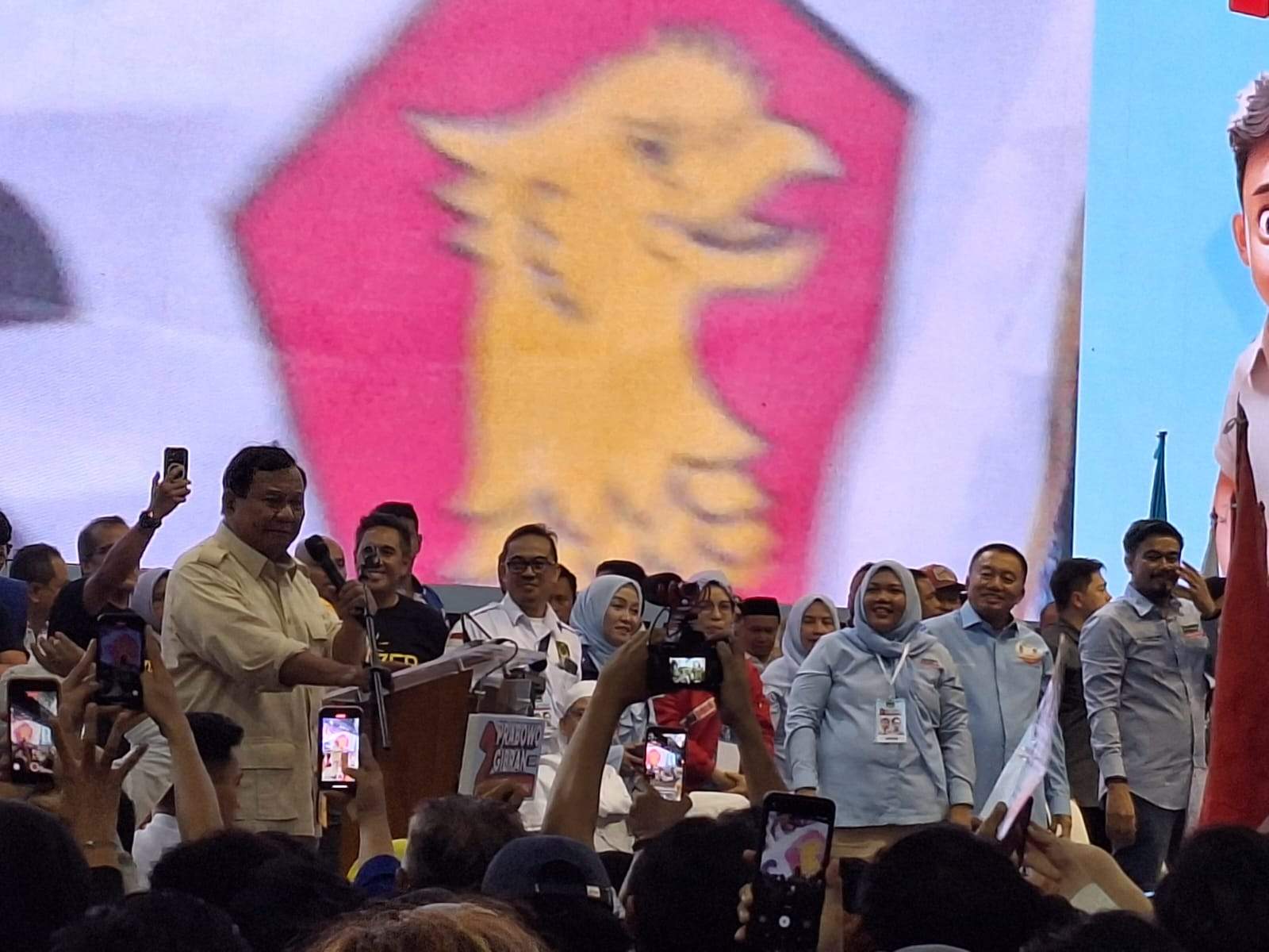 Setibanya di GOR Rudy Resnawan, puluhan ribu pendukungnya bergemuruh dengan menyebut nama Prabowo.