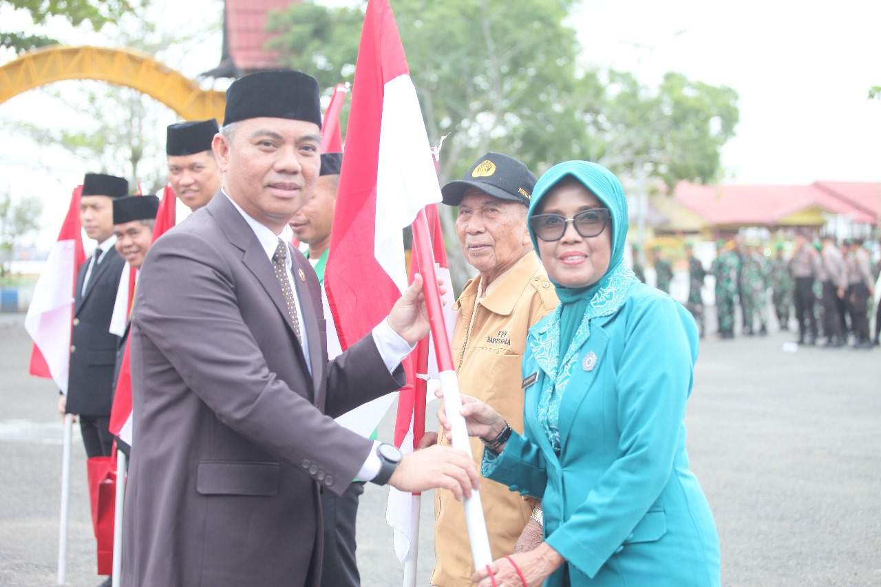 Penyerahan bendera simbolis diserahkan oleh Pj. Bupati Batola Mujiyat yang diwakili oleh Sekretaris Daerah Ir. H. Zulkipli Yadi Noor, M.Sc. Pembagain bendera itu merupakan bagian dari launching 10 Juta Bendera Merah Putih serentak diseluruh Indonesia dan Barito Kuala mentargetkan pembagian sebanyak 8.500 bendera.