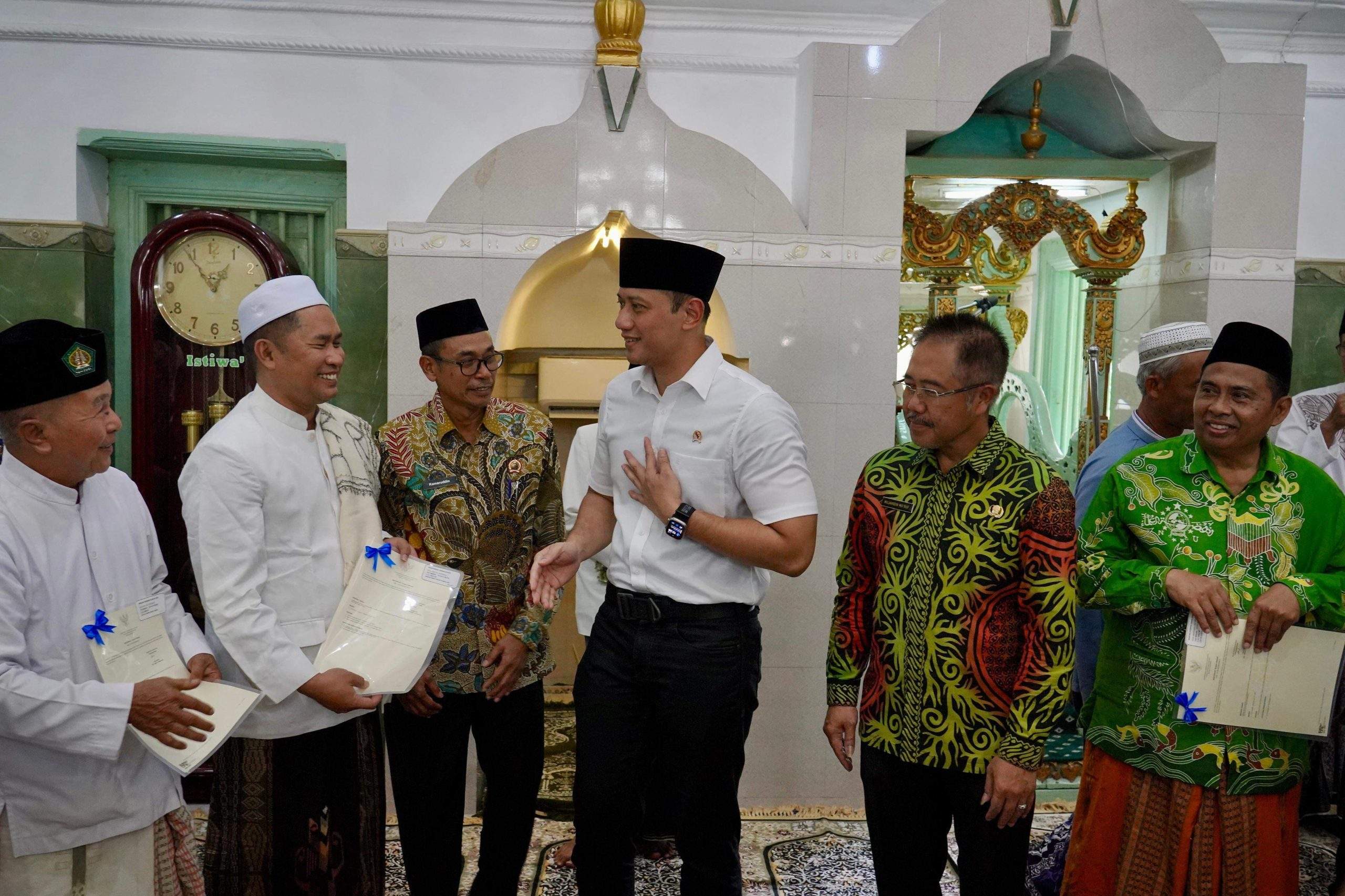 “Alhamdulillah di hari Jumat yang penuh berkah ini saya bisa kembali berkunjung ke Provinsi Jatim, tadi begitu landing langsung menuju ke Gresik untuk melakukan ibadah Salat Jumat berjamaah di Masjid Kanjeng Sunan Giri sekaligus setelah itu kami menyerahkan sertipikat wakaf,” ujar Menteri AHY kepada awak media usai melakukan semua rangkaian kegiatan di lokasi tersebut.