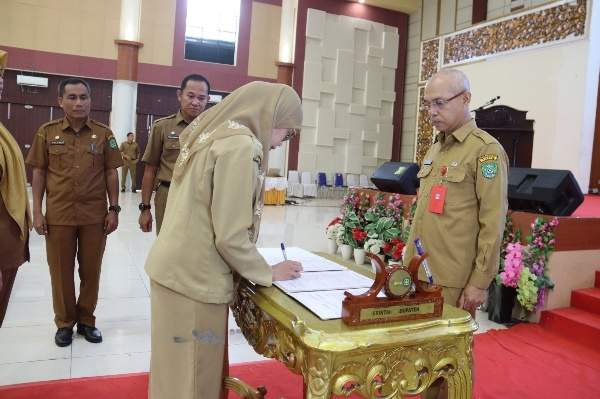 Acara tersebut dihadiri oleh Asmintum H. Fiqri Irmawan, SSTP, Kepala BKPSDM H. Gusti Ridha Jaya Wardhana sebagai saksi, serta Kepala Dinas Kesehatan Dr. H. Alfian Yusuf dan pejabat BKPSDM Kabupaten Tapin lainnya.