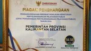 Pemprov Kalsel dianugerahi predikat Penilaian Kepatuhan Penyelenggaraan Pelayanan Publik dengan nilai 94,58, yang artinya masuk ke dalam 10 terbaik Provinsi se-Indonesia.