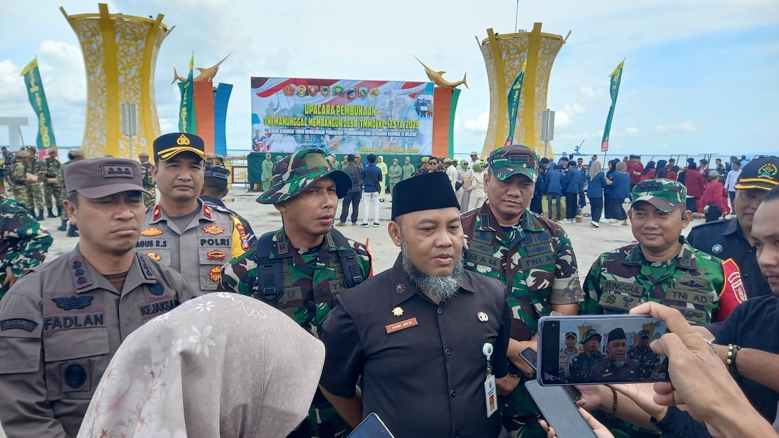 Staf Ahli Bupati Kotabaru Zainal Abidin, memberikan penjelasan TMMD di dampingi Dandim 1004/Ktb, Kasi Ops Rem Banjarmasin di Siring Laut. Foto: Putri/lenterakalimantan.com