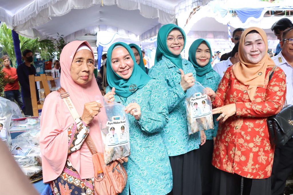 Dikesempatannya, Ketua TP PKK Kalsel, Fathul Jannah Muhidin juga mengunjungi stan Dislutkan Kalsel dan sangat mengapresiasi pembagian ikan gratis untuk menekan angka stunting di Kalsel.