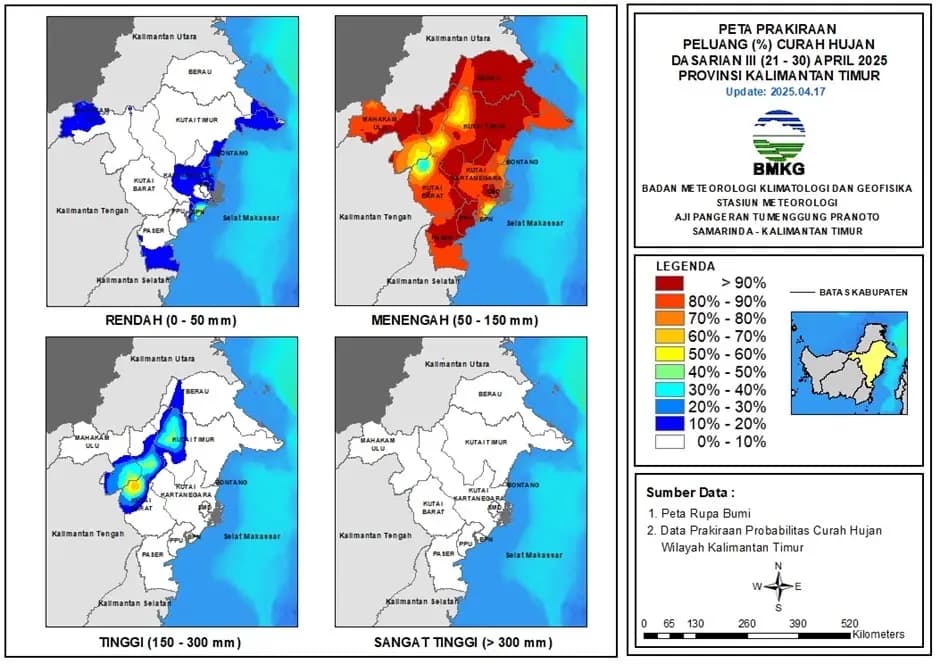 lenterakalimantan.com, SAMARINDA – Badan Meteorologi, Klimatologi, dan Geofisika (BMKG) Stasiun APT Pranoto Samarinda memprakirakan sebagian besar wilayah Kalimantan Timur akan diguyur hujan dengan intensitas menengah hingga tinggi pada dasarian III, yakni periode 21–30 April 2025.