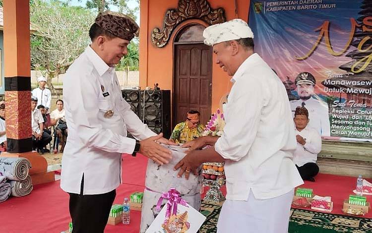 Di akhir acara, Bupati M. Yamin menyerahkan bantuan ambal kepada pengurus Pura Sindu Dharma sebagai bentuk perhatian pemerintah terhadap kebutuhan sarana ibadah umat Hindu.
