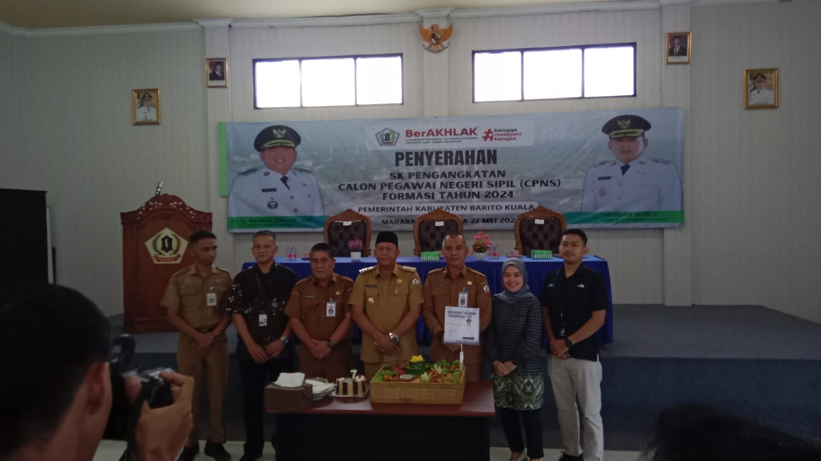 Bupati H. Bahrul Ilmi secara resmi menyerahkan 83 Surat Keputusan (SK) Calon Pegawai Negeri Sipil (CPNS) formasi tahun 2024 dalam acara yang digelar di Aula Badan Kepegawaian, Pendidikan, dan Pelatihan (BKPP) Barito Kuala, Selasa (27/5/2025). Foto: Pemkab Batola