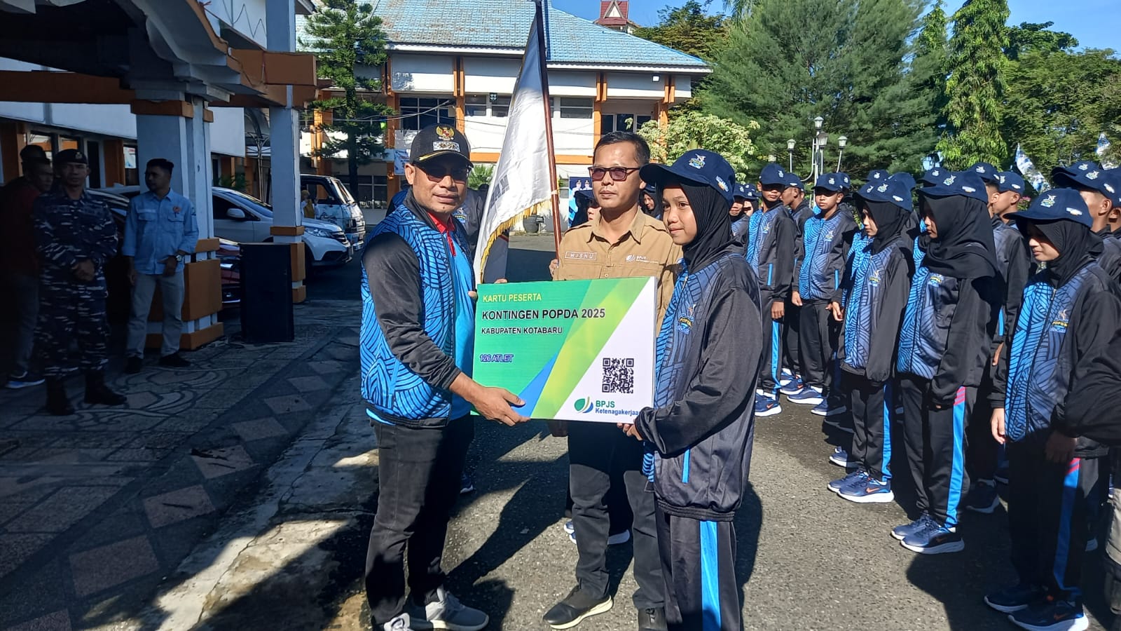 Di kesempatan itu juga Kepala BPJS Ketenagakerjaan Kotabaru Wisnu secara simbolis menyerahkan kartu Peserta BPJS Ketenagakerjaan kepada para kontingen atlet Popda 2025.