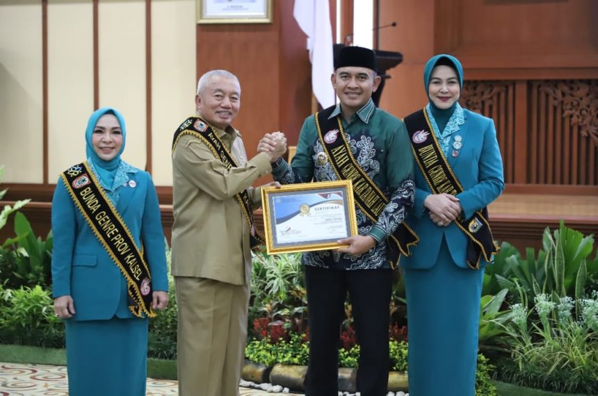 Penghargaan diserahkan oleh Gubernur Kalimantan Selatan H Muhidin kepada Bupati Tanah Laut H Rahmat Trianto dan Ketua TP PKK Tanah Laut Hj Dian Rahmat.