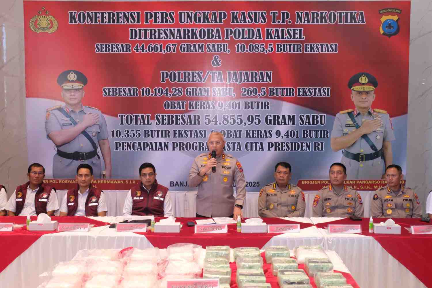 Kabid Humas Polda Kalsel Kombes Pol Adam Erwindi, mengatakan, dalam konferensi pers tersebut Kapolda Kalsel menyampaikan rincian barang bukti yang berhasil diamankan terdiri dari Ditresnarkoba Polda Kalsel 44.661,67 gram Sabu dan 10.085,5 butir Ekstasi. Kemudian, Polres/ta Jajaran Polda Kalsel mengamankan 10.194,28 gram Sabu, 269,5 butir Ekstasi dan 9.401 butir Obat Keras.