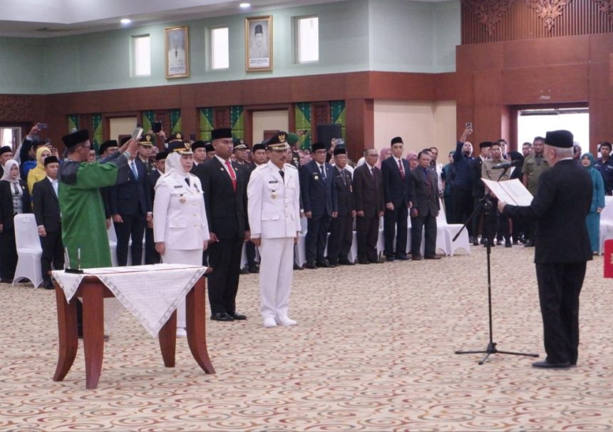 Mengenakan seragam resmi kepala daerah Lisa dan Wartono melakukan pengucapan sumpah jabatan,l yang langsung Gubernur Muhidin menyematkan tanda jabatan.