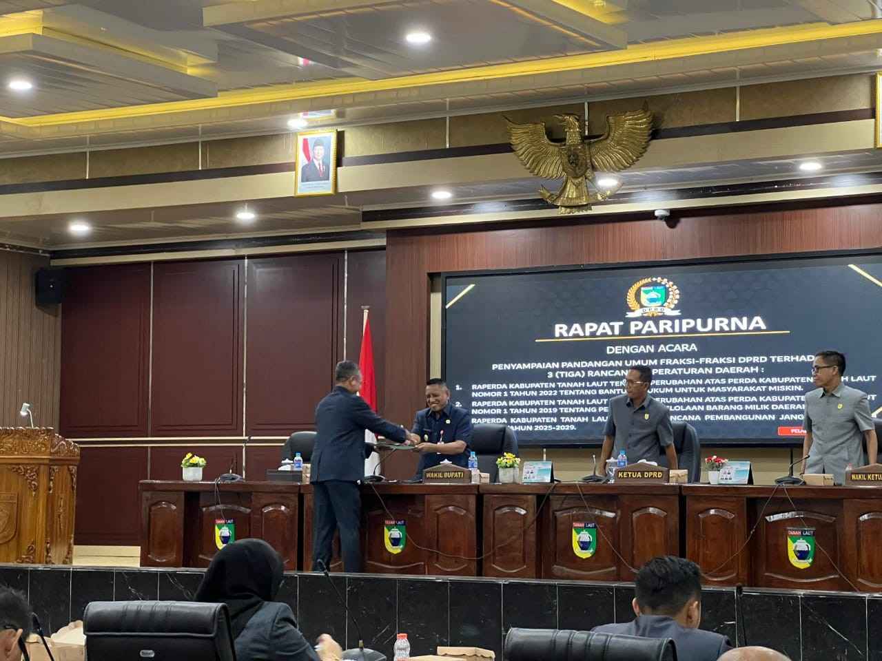 Sebelumnya, seluruh fraksi-fraksi di DPRD Tanah Laut terdiri dari PDI Perjuangan , NasDem, PKB, Hanura, Demokrat, PAN, Golkar, PPP, Gerindra, dan PKS, menyampaikan pandangan mereka secara bergiliran terkait muatan serta urgensi ketiga Raperda tersebut.