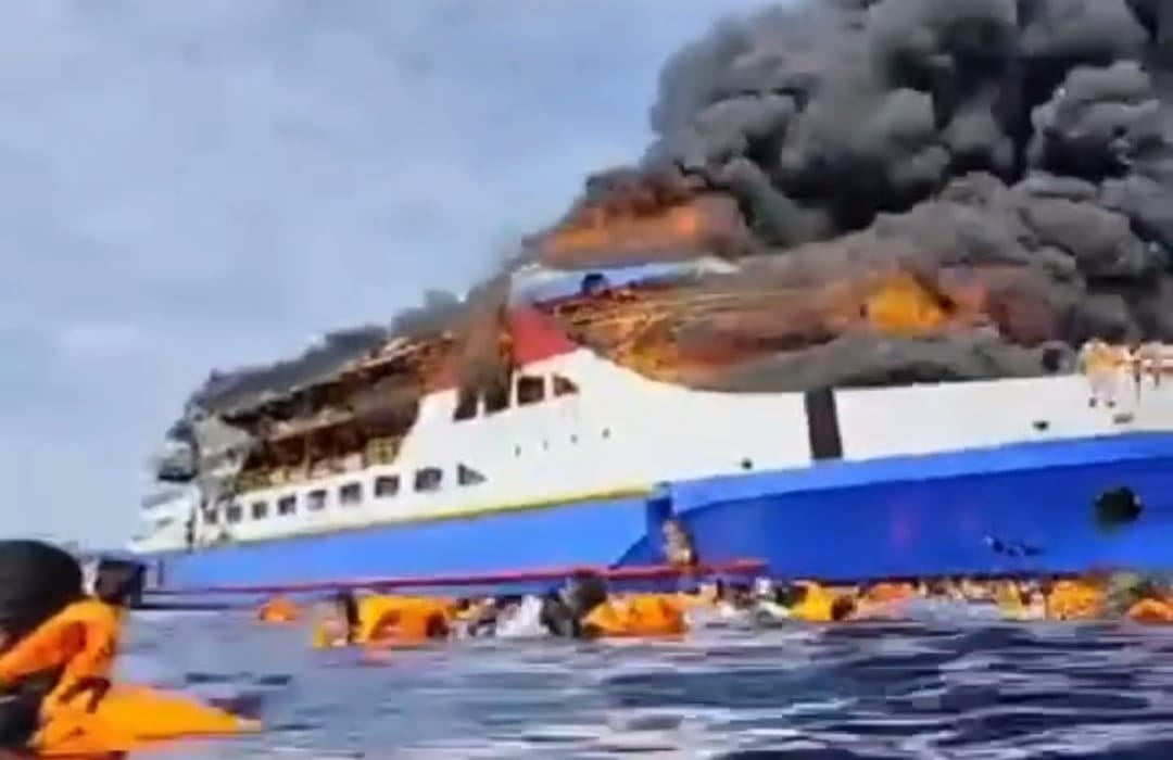Asap tebal dan kobaran api terlihat dari bagian belakang kapal, membuat puluhan penumpang memilih melompat ke laut untuk menyelamatkan diri.