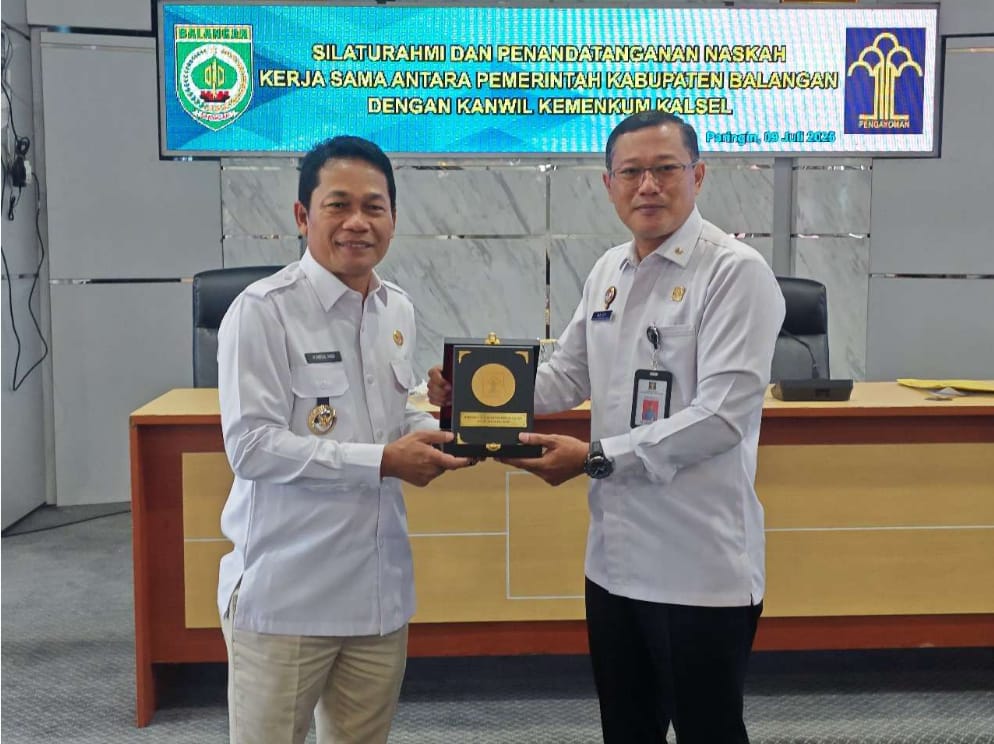 Bupati Balangan, Abdul Hadi, saat menerima plakat kenang-kenangan dari Plt Kepala Kanwil Kemenkumham Kalsel, Meidy Firmansyah, di Kantor Bupati Balangan. Foto: MC Balangan