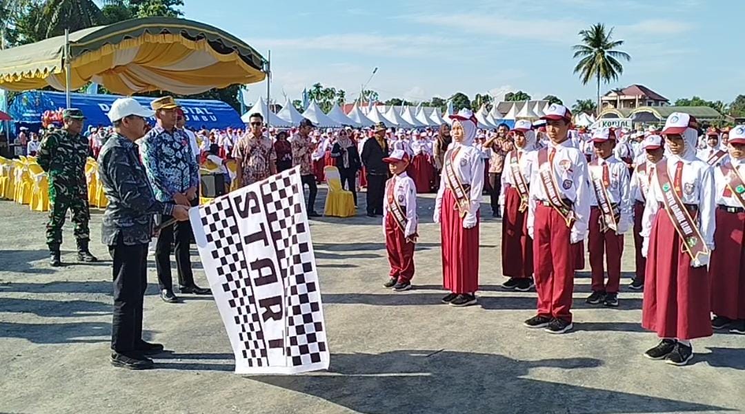 Kepala Dinas Pendidikan Kab. Tanah Bumbu H. Amiluddin didampingi Sekretaris Disdik Dwi Teguh Effendi saat melepas peserta lomba gerak jalan. Foto: Arif/LK