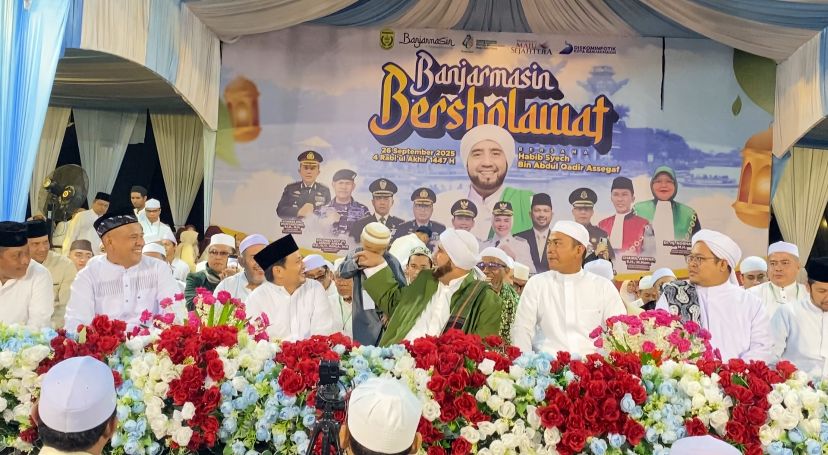 lenterakalimantan.com, BANJARMASIN – Ribuan jamaah tumpah ruah memadati halaman Balai Kota Banjarmasin, Jumat (27/09/25) malam, dalam rangka Banjarmasin Bersholawat bersama Habib Syech bin Abdul Qodir Assegaf.