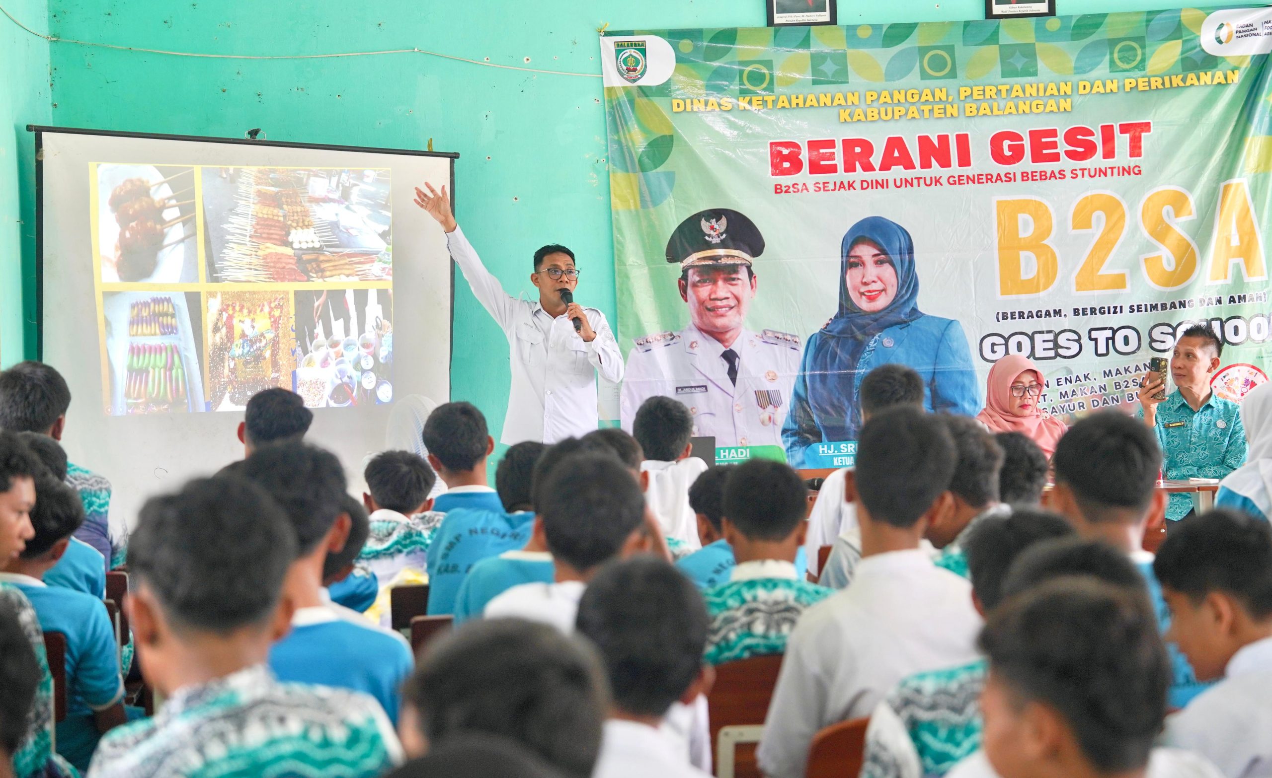 lenterakalimantan.com, BALANGAN – Dinas Ketahanan Pangan, Pertanian, dan Perikanan (DKP3) Kabupaten Balangan memberikan edukasi pangan bergizi dan sehat kepada pelajar melalui program B2SA (Beragam, Bergizi, Seimbang, dan Aman) Goes To School. Kegiatan ini digelar di SMP Negeri 1 Juai, Desa Mungkur Uyam, Kecamatan Juai, pada Rabu (10/9/2025).