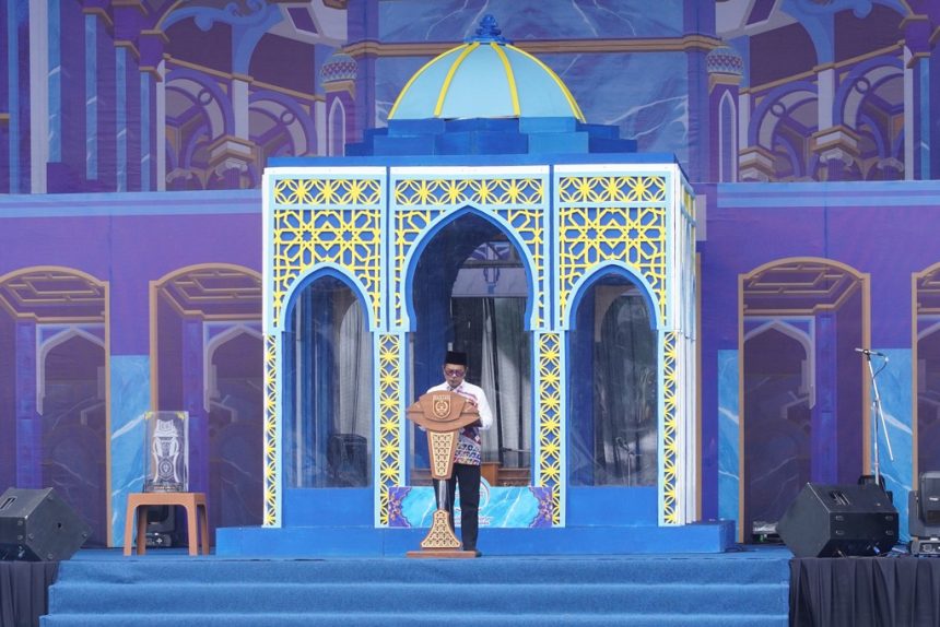Camat Astambul, Akhmad Fauzie, menyampaikan sambutan pada pembukaan pameran UMKM dalam rangkaian MTQ ke-48 tingkat Kabupaten Banjar di Astambul, Senin (8/9/2025). Foto: Humas Banjar