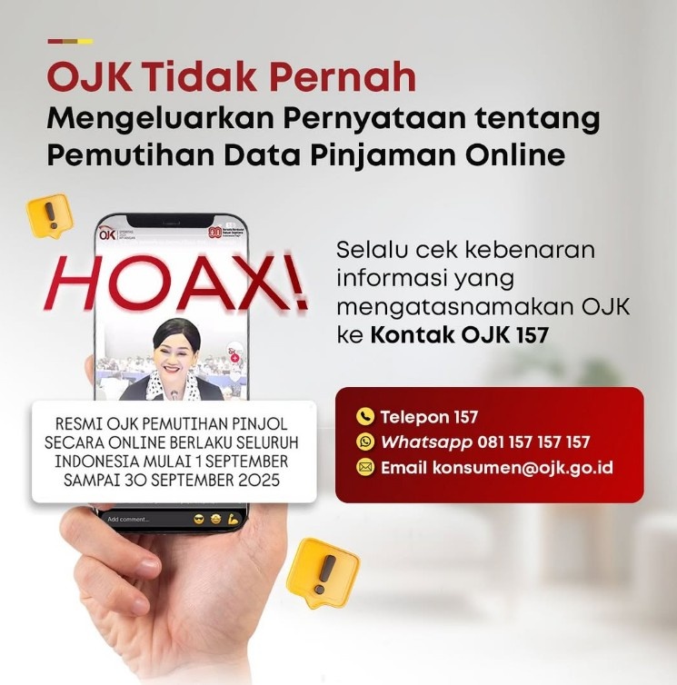 lenterakalimantan.com, JAKARTA – Otoritas Jasa Keuangan (OJK) menegaskan tidak pernah mengeluarkan pernyataan terkait pemutihan data Pinjaman Online (Pinjol). Penegasan ini disampaikan menyusul beredarnya informasi palsu atau hoaks di media sosial belakangan ini.