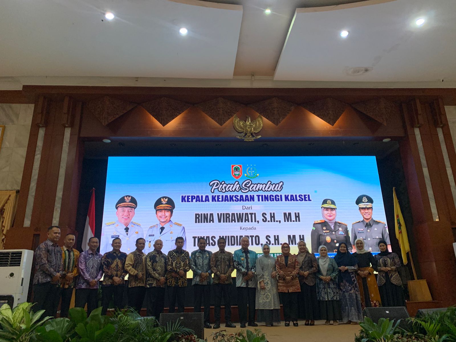 lenterakalimantan.com, BANJARMASIN – Gubernur Kalimantan Selatan (Kalsel), H. Muhidin bersama Ketua TP PKK Kalsel, Hj. Fathul Jannah, menghadiri malam pisah sambut Kepala Kejaksaan Tinggi (Kajati) Kalsel dari pejabat lama, Rina Virawati, kepada pejabat baru, Tiyas Widiarto. Acara tersebut berlangsung di Mahligai Pancasila Banjarmasin, Senin (27/10/2025).