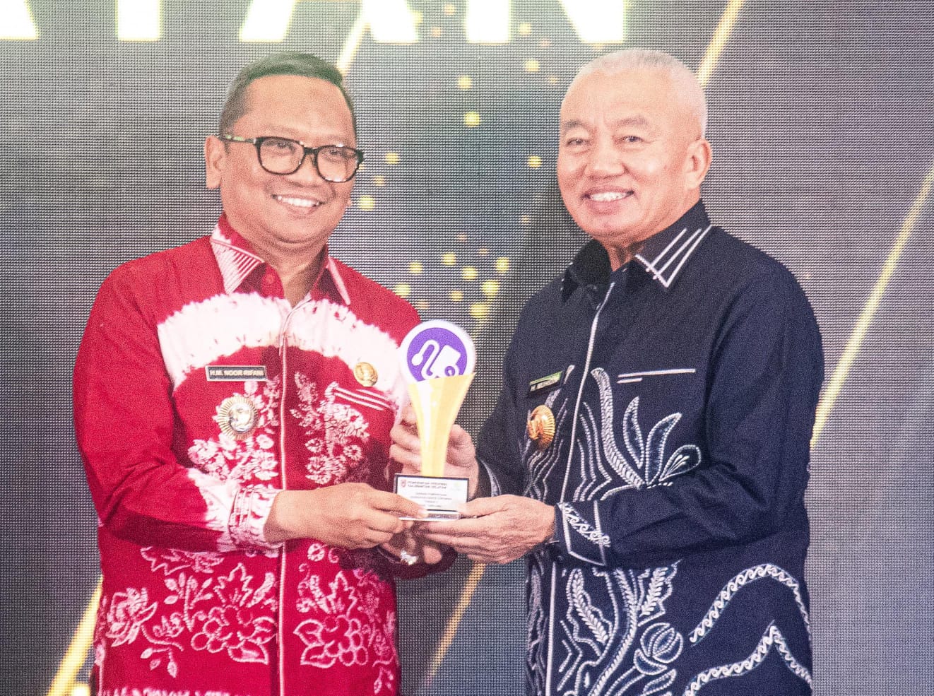 Gubernur Kalsel, H Muhidin menyerakan penghargaan kepada Bupati Tabalong, H Muhammad Noor Rifani. Foto: Humas Prokopim
