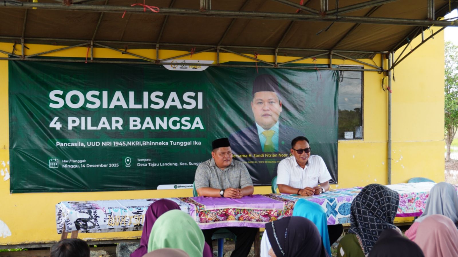 “Empat Pilar Kebangsaan bukan konsep teoritis untuk dihafal, melainkan “pedoman praktis” dan “vaksin sosial” dalam menghadapi tantangan bangsa seperti intoleransi dan penyebaran berita bohong (hoax),”kata Bang Sandi begitu Sandi Fitrian Noor Disapa saat hadir ditengah-tengah warga Desa Tajau Landung Kecamatan Sungai Tabuk, Minggu (14/12/2025).