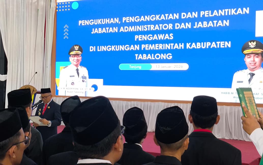 lenterakalimantan.com, TANJUNG – Pemerintah Kabupaten (Pemkab) Tabalong melakukan penyegaran organisasi melalui pengukuhan dan pelantikan pejabat administrator dan pengawas, Selasa (13/1/2026), di Pendopo Bersinar, Pembataan. Sebanyak 422 pejabat resmi menempati posisi baru, terdiri dari 359 pejabat yang dikukuhkan dan 63 pejabat yang dilantik.