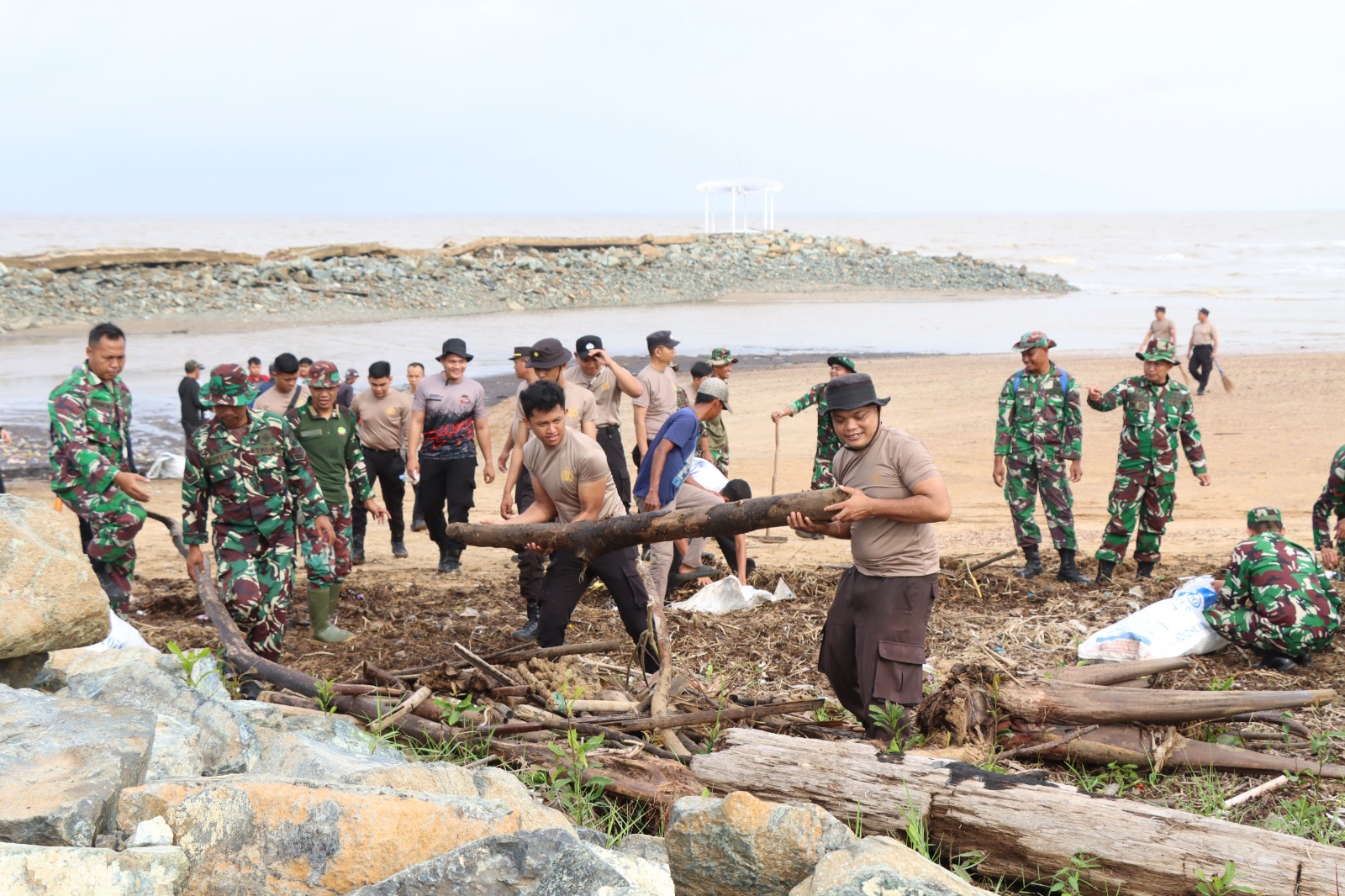 Personel gabungan menyisir kawasan pesisir dengan memungut sampah plastik, ranting, dan limbah yang terbawa arus laut. Pembersihan juga dilakukan pada fasilitas umum serta penataan area pantai.