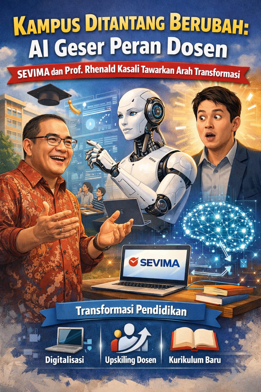 Pesan ini mengemuka dalam Executive Workshop yang digelar SEVIMA bersama Rhenald Kasali, Guru Besar Fakultas Ekonomi dan Bisnis Universitas Indonesia sekaligus Founder Rumah Perubahan, yang diikuti ratusan pimpinan perguruan tinggi dari seluruh Indonesia.