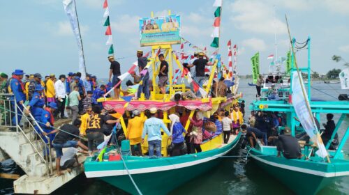 Puluhan kapal nelayan dari berbagai ukuran tampak berlayar menuju perairan Pagatan untuk mengikuti prosesi adat yang digelar oleh Lembaga Ade Oge. Tradisi ini menjadi daya tarik utama dalam rangkaian pesta budaya tahunan tersebut.