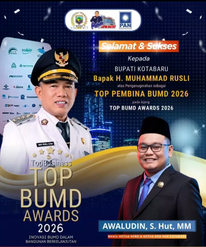 lenterakalimantan.com, KOTABARU – Wakil Ketua I DPRD Kotabaru, Awaludin, mengapresiasi Bupati Kotabaru, Muhammad Rusli, atas diraihnya penghargaan TOP Pembina BUMD Awards 2026.